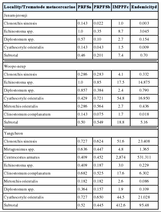 Locality/Trematode metacercariae PRFSa PRPFSb IMPPFc Endemicityd
