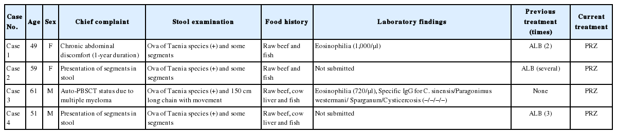 T. saginata in Korea. Here, we summarize 4 cases of taeniasis caused by