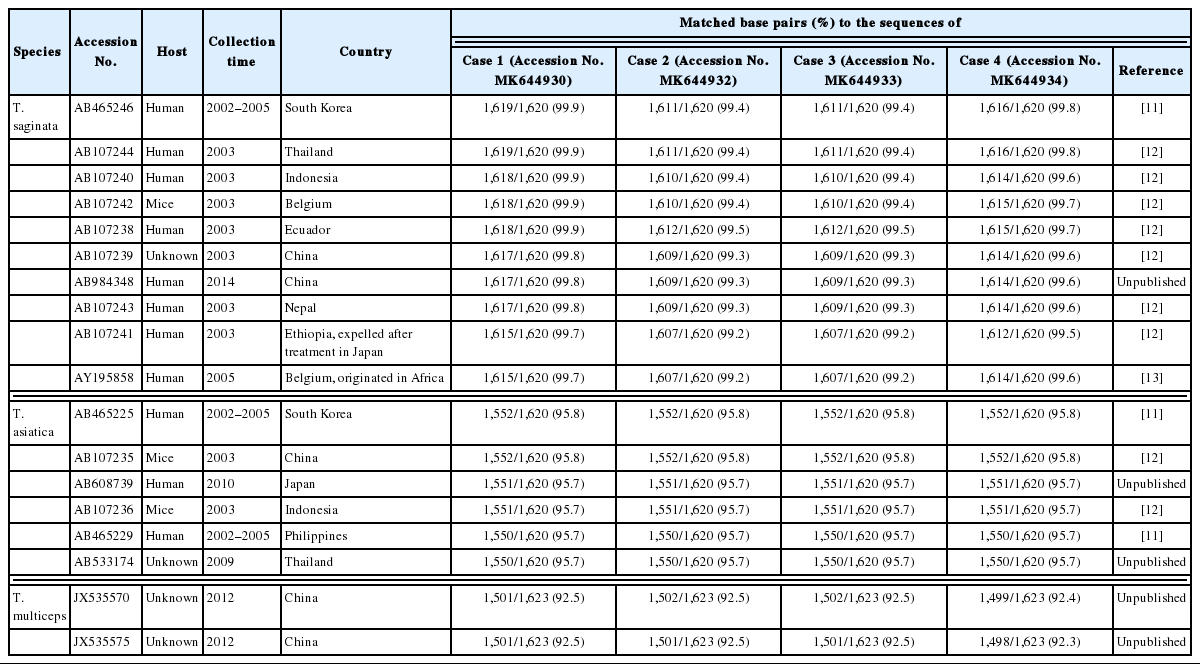 - 9. Cho J, Jung BK, Lim H, Kim MJ, Yooyen T, Lee D, Eom KS, Shin EH, Chai JY. Four cases of Taenia saginata infection with an analysis of COX1 gene. Korean J Parasitol 2014;52:79-83.