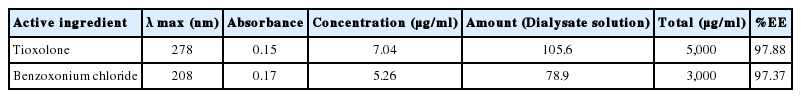 11] in selected formulations using the dialysis bag (cellulose acetate membrane, Sigma-Aldrich, Steinheim, Germany) at 37°C for certain time intervals (0, 15, 30, 60, 90, 120, 150, 180, 210, 240 min). The drugs concentrations in the samples were measured using the spectrophotometric method at 287.9 nm for tioxolone and at 208 nm for benzoxonium chloride. Also, encapsulation efficiency was performed by dialysis method and calculated the entrapped drug [