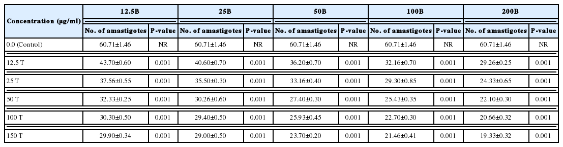 Table 1, which represents that with increasing concentration of each drug, the number of amastigotes was decreased. This combination of T150 μg/ml and B200 μg/ml showed the least number of amastigotes (19.33±0.34). Also, in niosomal formulations, with increasing concentration, the number of amastigotes were decreased, so that, the least number of amastigote (10.51±0.43) belongs to the highest concentration of NTB