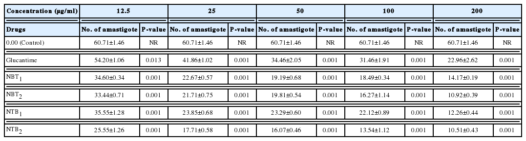 Table 3Comparative evaluation of various concentrations of the combination niosomes and glucantime with untreated control on intramacrophage amastigotes of L. tropica after 48 hr incubation (P≤0.05) (NT1B and NT2B: serial dilutions were based on NB; NTB1 and NTB2: serial dilutions were based on NT)