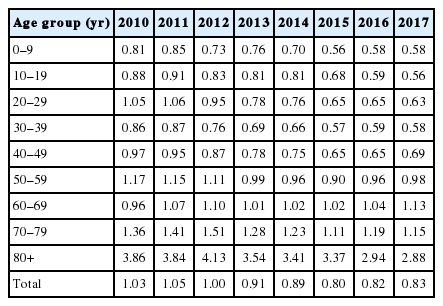 The prevalence of scabies per 1,000 persons was similar in children, adolescents, and adults under 50 years of age, ranging from 0.56 to 1.06, but the prevalence increased from age 50 to older age (Table 2). In particular, the prevalence of 2.88–3.86 per 1,000 persons in the group over 80 years old was 4–5 times higher than that of the younger age group. From 2010 to 2017, the overall prevalence decreased in all age groups, and the prevalence of scabies in the entire population decreased from 1.03 per 1,000 persons in 2010 to 0.83 per 1,000 persons in 2017.