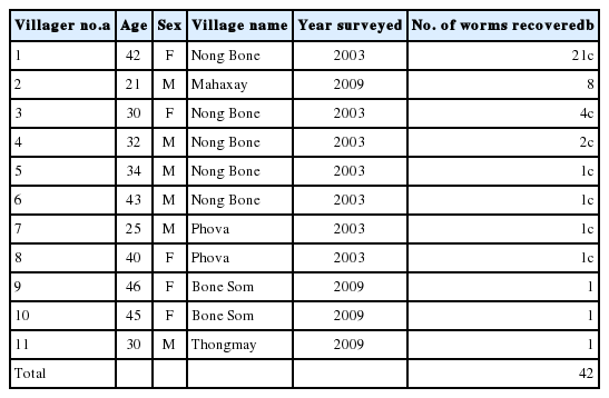 - 10. Chai JY, Sohn WM, Jung BK, Yong TS, Eom KS, Min DY, Insisiengmay B, Insisiengmay S, Phommasack B, Rim HJ. Intestinal helminths recovered from humans in Xieng Khouang Province, Lao PDR with a particular note on Haplorchis pumilio infection. Korean J Parasitol 2015;53:439-445.