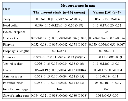 Table 2Measurements of Echinochasmus caninus adult specimens recovered from riparian people in Khammouane Province, Lao PDR in comparison with those in a previous report