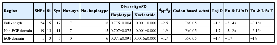 26]. The diversity towards the non-EGF and the double EGF domains were of similar levels (π=0.00010–0.00016), however, the number of SNPs towards the non-EGF domains was higher than EGF domain (