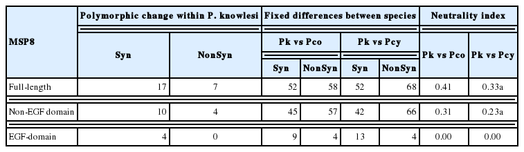 pkmsp8 full-length gene as well as at each domain (EGF and non-EGF), multiple tests were conducted; at the intra-species level significant negative value was observed at the full-length gene and at the non-EGF domain (