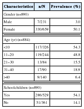 In the community survey, 890 participants from 9 hamlets in 3 villages joined the study. All were willing to be tested for head lice. As shown in Table 1, about half of the 659 women in the study area were infested with head lice, compared with only 3% of the 231 men. About half of the infested cases were aged 5–20 years; a decreasing trend was observed, with 15–20% among those aged 21–40 years, and 6% among those aged >40 years. About half of the infested cases were schoolchildren.
