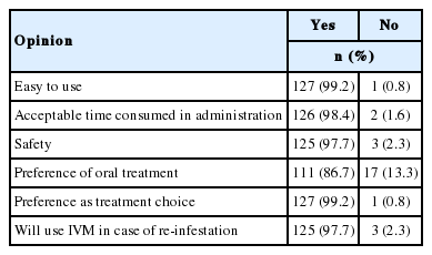 In the post-treatment survey, 128 study participants provided their opinions regarding the use of IVM as a treatment choice. As shown in Table 4, almost all participants indicated that IVM was easy to use and did not involve a long treatment time. Most participants also accepted that the treatment was safe. Interestingly, while about 87% preferred oral treatment compared with 13% preferring topical treatment, almost all would choose this medication as their treatment choice and use it to treat head-lice re-infestations in future.