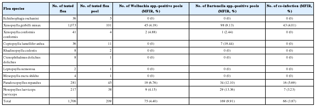 Flea species No. of tested flea No. of tested flea pool No. of Wolbachia spp.-positive pools (MFIR, %) No. of Bartonella spp.-positive pools (MFIR, %) No. of co-infection (MFIR, %)