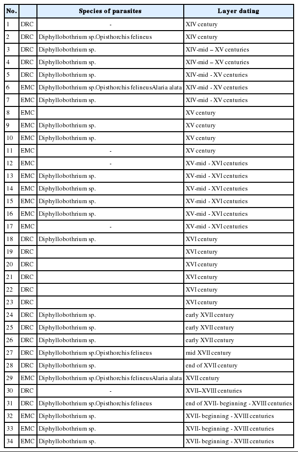 • 12. Slepchenko S, Kardash O, Ivanov S, Afonin A, Shin DH, Hong JH. The Buchta-Nakhodka 2 burial ground: Results of archaeoparasitological and macro-remains investigations of samples from the burial grounds of the 6th–13th century CE on the Yamal Peninsula in Russia. J Archaeol Sci Reports 2019;23:791-799.