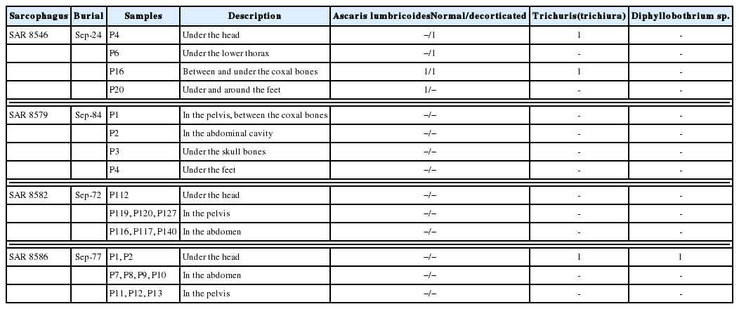Out of the 4 studied individuals, only the adult samples tested positive to the presence of gastrointestinal parasites. Two parasite taxa were identified in each adult burial (