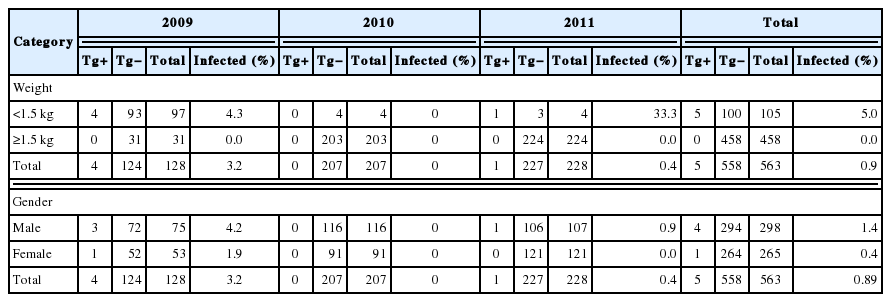 Table 1 Excretion of T. gondii oocysts from feral cats trapped from 2009 to 2011 in Korea