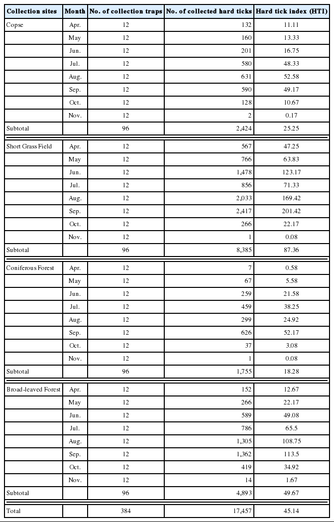 Table 1 Collection rate and hard tick index for 8 months in Ganghwa during 2015–2018 using collection traps
