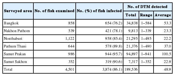 Surveyed area No. of fish examined No. (%) of fish infected No. of DTM detected