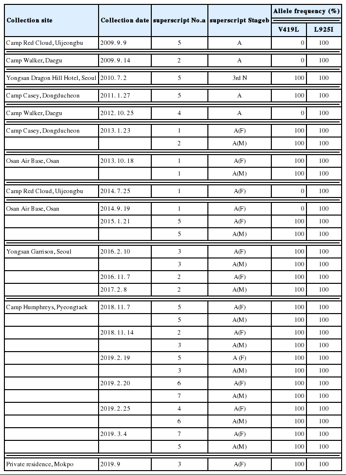 Table 1). However, the L925I mutation frequency was 100%, indicating that the 2 mutations can be present as independent alleles and that there are 2 different resistant haplotypes (one with only the L925I mutation and the other with both V419L and L925I mutations). The V410L mutation was saturated to 100% in bed bugs collected from the same site (Osan air base, Pyeongtaek, Korea) following year (2015), indicating a strong pyrethroid selection pressure at this site. Nevertheless, both mutations appeared to be saturated in all bed bug populations collected in more recent years (2015–2019) (