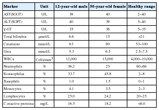 Table 2 Hematology and biochemistry values of the 2 cases