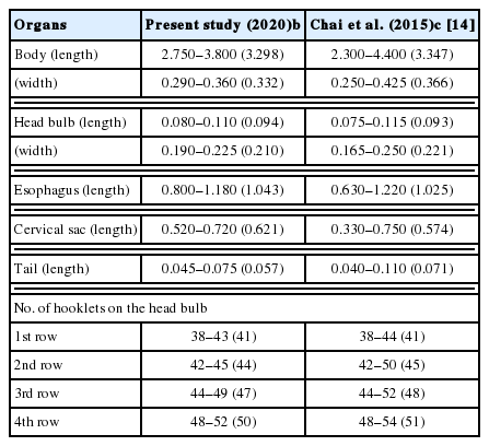 Fig. 1B) were 2.75–3.80 (av. 3.30) mm long and 0.29–0.36 (av. 0.33) mm wide. They had a characteristic head bulb (av. 0.094×0.210 mm) with 4 rows (rarely 5 rows) of hooklets, a muscular long esophagus (0.80–1.18 mm long), and 2 pairs of cervical sac (0.52–0.72 mm long). The mean number of hooklets were 41, 44, 47, and 50 on the 1st, 2nd, 3rd, and 4th row, respectively (