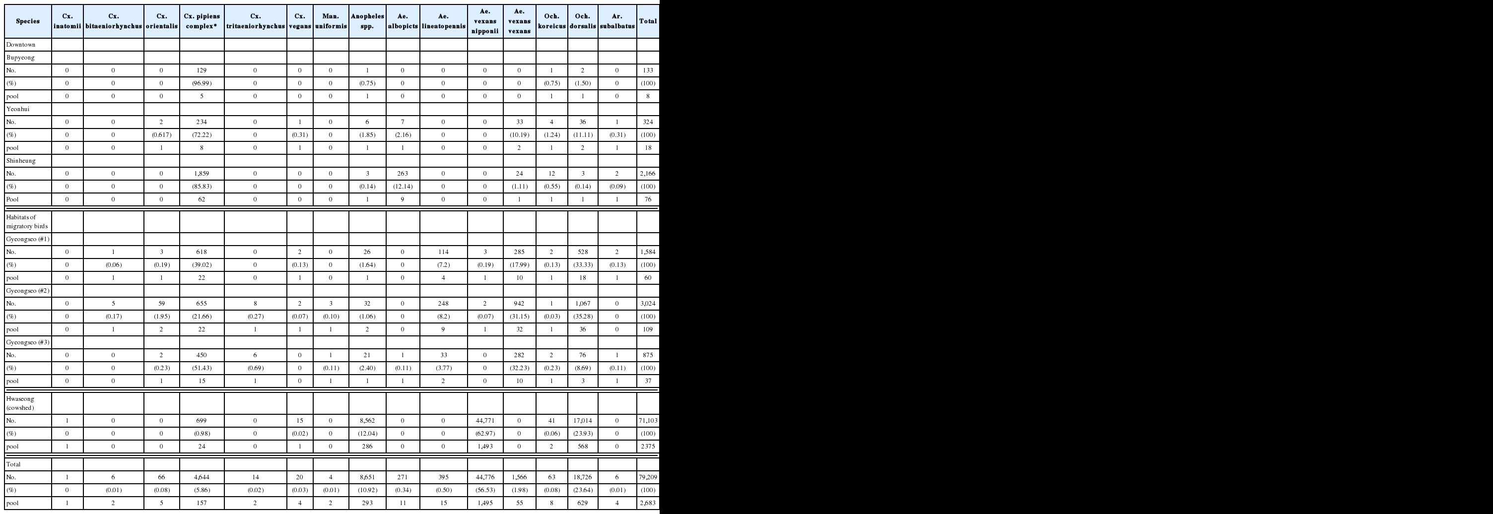 Cx. pipiens pallens is a nuisance mosquito that exists widely throughout Korea and was the most frequently captured mosquito in the habitat of migratory birds (