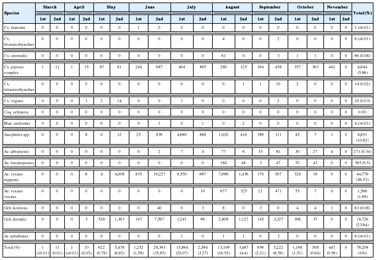- 25. Kim HC, Chong ST, Pike JG, O’Guinn MI, Pacha LA, Lee HC, Klein TA. Seasonal prevalence of mosquitoes collected from light traps in the Republic of Korea. Entomol Res 2002;34:177-186.