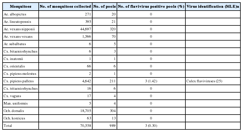 - 28. Takhampunya R, Kim HC, Tippayachai B, Lee DK, Lee WJ, Chong ST, Kim MS, Lee JS, Klein TA. Distribution and mosquito hosts of Chaoyang virus a newly reported flavivirus from the Republic of Korea, 2008–2011. J Med Entomol 2014;51:464474.