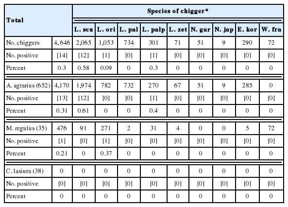 Table 4The number and percents of chiggers, by species, colleceted from A. agrarius and M. regulus in the Republic of Korea from September 2014 to August 2018, which were positive for Orientia tsutsugamushi