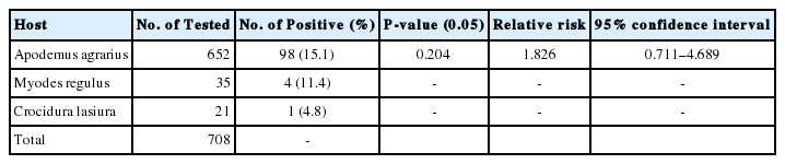 Apodemus agrarius was the predominant rodent collected and was not associated (relative risk, 1.826; 95% CI, 0.711–4.689) (