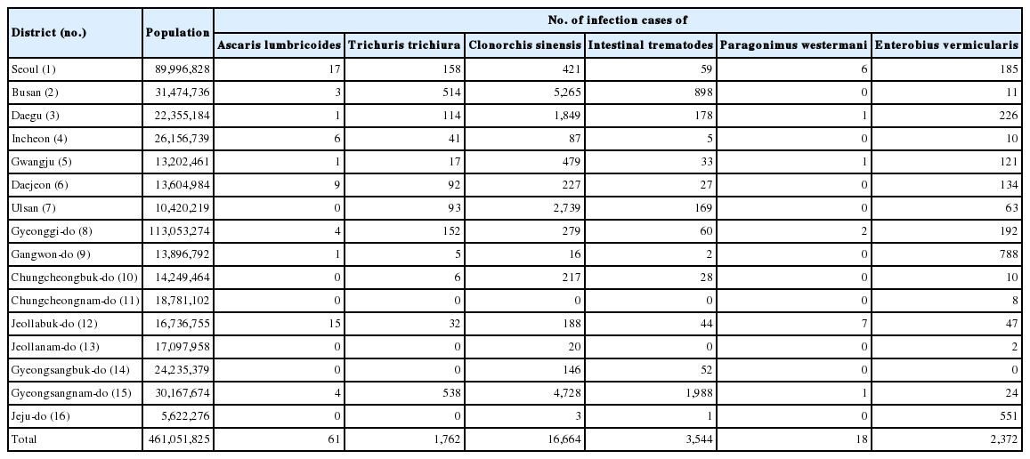 The nationwide parasitic infection cases reported for 9 years (2011–2019) were collected from 16 administrative districts by the Korea Disease Control and Prevention Agency (KCDA) [