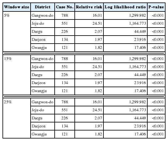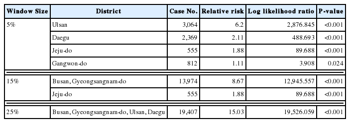 Table 3). Overall, 15% and 25% analysis showed that big clusters including Busan and Gyeongsangnam-do region had notably high risk of indicating