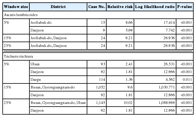 With 5% maximum cluster size, the cases of A. lumbricoides were most likely cluster in Jeollabuk-do, indicating the risk of A. lumbricoides infection was 8.7 times higher in Jeollabuk-do than other areas. The secondary cluster was Daejeon. With 15% of maximum cluster size, the most likely cluster was Jeollabuk-do and Daejeon. Clustering with 25% window was same to that of 15%. The cases of A. lumbricoides infection were mainly distributed in Jeollabuk-do.