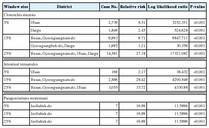 For intestinal trematodes, with 5% maximum cluster size, the most likely cluster was Ulsan with relative risk of 2.2, indicating that the intestinal trematode infections in Ulsan was 2.2 times higher than in the other areas. With 15% maximum cluster size, the most likely cluster was Busan and Gyeongsangnam-do with relative risk of 28.4. With 25% maximum cluster size, the most likely cluster was Busan, Gyeongsangnam-do and Ulsan with relative risk of 33.7. In summary, the intestinal trematode infection was of high risk in Gyeongsangnam-do region.