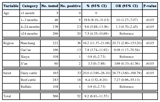 G. lamblia was detected in 9.2% (95% CI 6.81–11.57) of 556 cattle fecal samples from 4 cities of Jiangxi province, with the prevalence ranging from 0.9% to 16.2% (