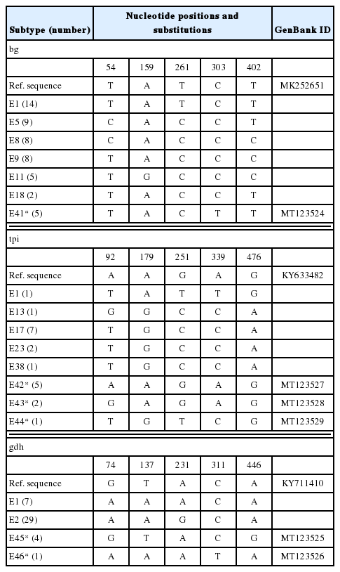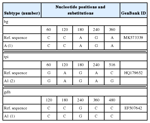 - 20. Lalle M, Pozio E, Capelli G, Bruschi F, Crotti D, Cacciò SM. Genetic heterogeneity at the beta-giardin locus among human and animal isolates of Giardia duodenalis and identification of potentially zoonotic subgenotypes. Int J Parasitol 2005;35:207-213. https://doi.org/10.1016/j.ijpara.2004.10.022