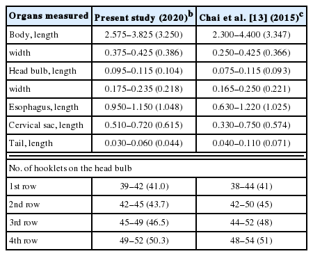 Fig. 1B). They had the characteristic head bulb (av. 0.104×0.218 mm) with 4 rows of hooklets, long muscular esophagus (av. 1.048 mm), and 2 pairs of cervical sacs (av. 0.615 mm). The number of hooklets in the 1st, 2nd, 3rd, and 4th row was 41, 44, 47, and 50 in average, respectively. Most of these morphological findings were similar with those of our previous study, Chai et al. [