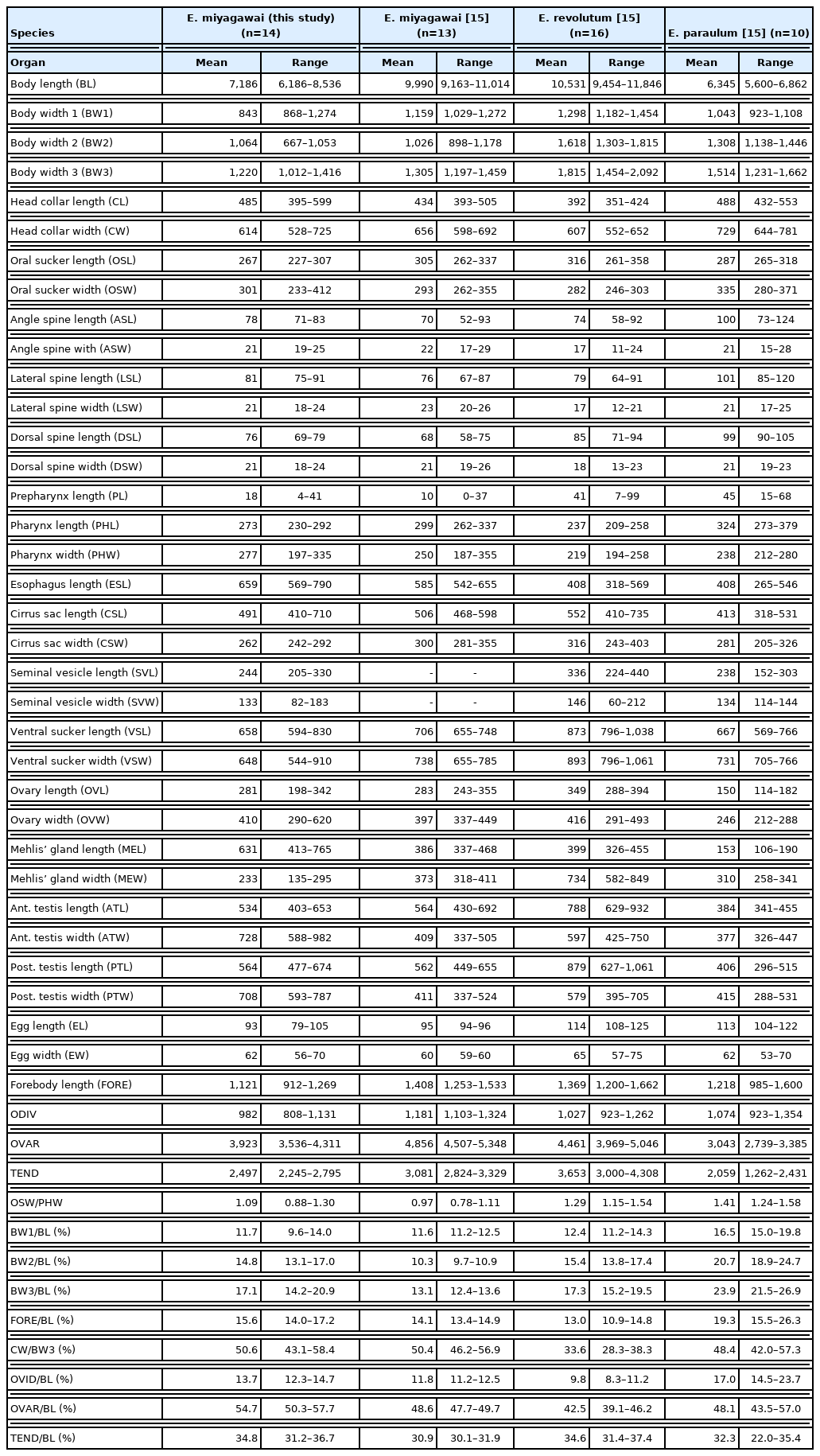 - 1. Chai JY, Cho J, Chang T, Jung BK, Sohn WM. Taxonomy of Echinostoma revolutum and 37-collar-spined Echinostoma spp.: a historical review. Korean J Parasitol 2020;58:343-371.