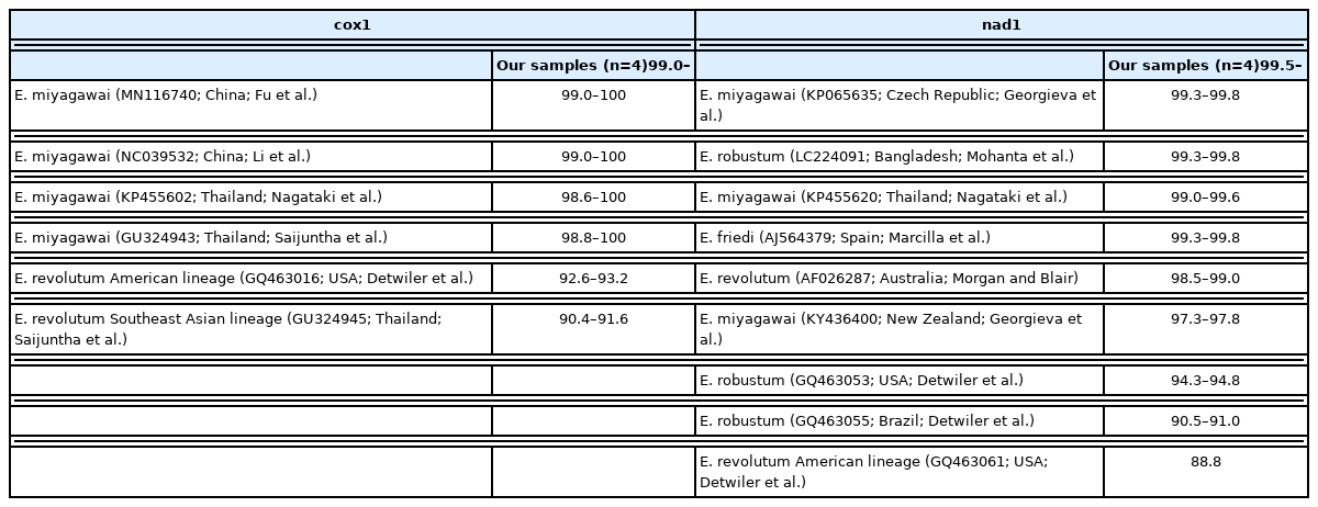 - 23. Mohanta UK, Watanabe T, Anisuzzaman , Ohari Y, Itagaki T. Characterization of Echinostoma revolutum and Echinostoma robustum from ducks in Bangladesh based on morphology, nuclear ribosomal ITS2 and mitochondrial nad1 sequences. Parasitol Int 2019;69:1-7.