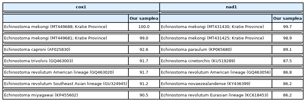 Table 1Comparison of our sample with Echinostoma mekongi from Kratie, Cambodia and other members of 37-collar-spined Echinostoma spp. based on cox1 and nad1 gene sequences