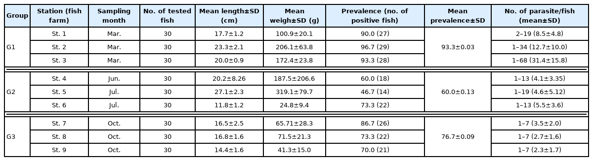 Table 1 Prevalence and intensity of the monogenean parasite, Microcotyle sebastis to the Korean rockfish, Sebastes schlegelii at the fish farms along the coasts of Tongyeong, Korea in 2016