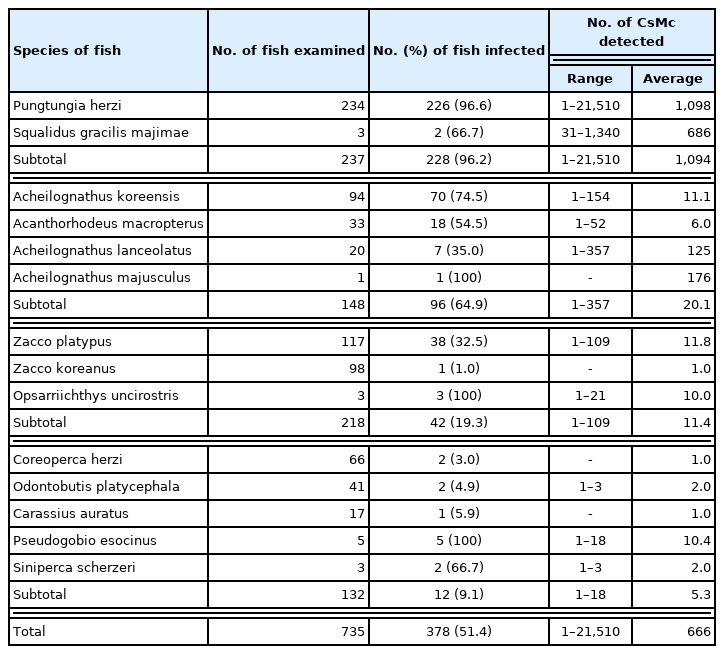 Table 1. In 2019, CsMc were detected in 172 (68.0%) out of 253 fishes in 10 species, and the infection intensity was 565 per fish infected. The infection status by the fish species and survey site was detailedly revealed in