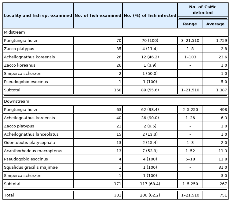 By the present study, it was confirmed for the first time that CsMc are highly endemic in fishes from Yongjeon-cheon, in Cheongsong-gun, Gyeongsangbuk-do, Korea. The infection status was revealed with a certain tendency by the subfamily groups, i.e., Gobioninae, Acheilognathinae and Rasborinae, in the cyprinid fish (family Cyprinidae) hosts of