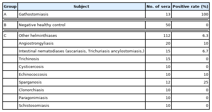 Gnathostoma-specific 24-kDa band by immunoblot. In addition, 50 healthy negative controls were collected from healthy donors with no history of exposure to parasites and no indication of helminth infection according to a stool examination at the time of blood collection. Details on the serum samples used in the current study are provided in