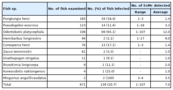 Table 4Overall infection status of Echinostoma spp. metacercariae (EsMc) in fish from Soyang-cheon (stream) in Wanju-gun, Jeollabuk-do, Korea