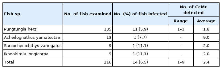Table 5Overall infection status of Clinostomum complanatum metacercariae (CcMc) in fish from Soyang-cheon (stream) in Wanju-gun, Jeollabuk-do, Korea
