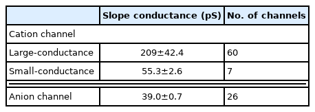 cis/trans) gradient. The cation channels were classified further into 2 groups by their conductance: large-conductance cation (209.3±42.4 pS, n=60) and small-conductance cation channels (55.3±2.6 pS, n=7;