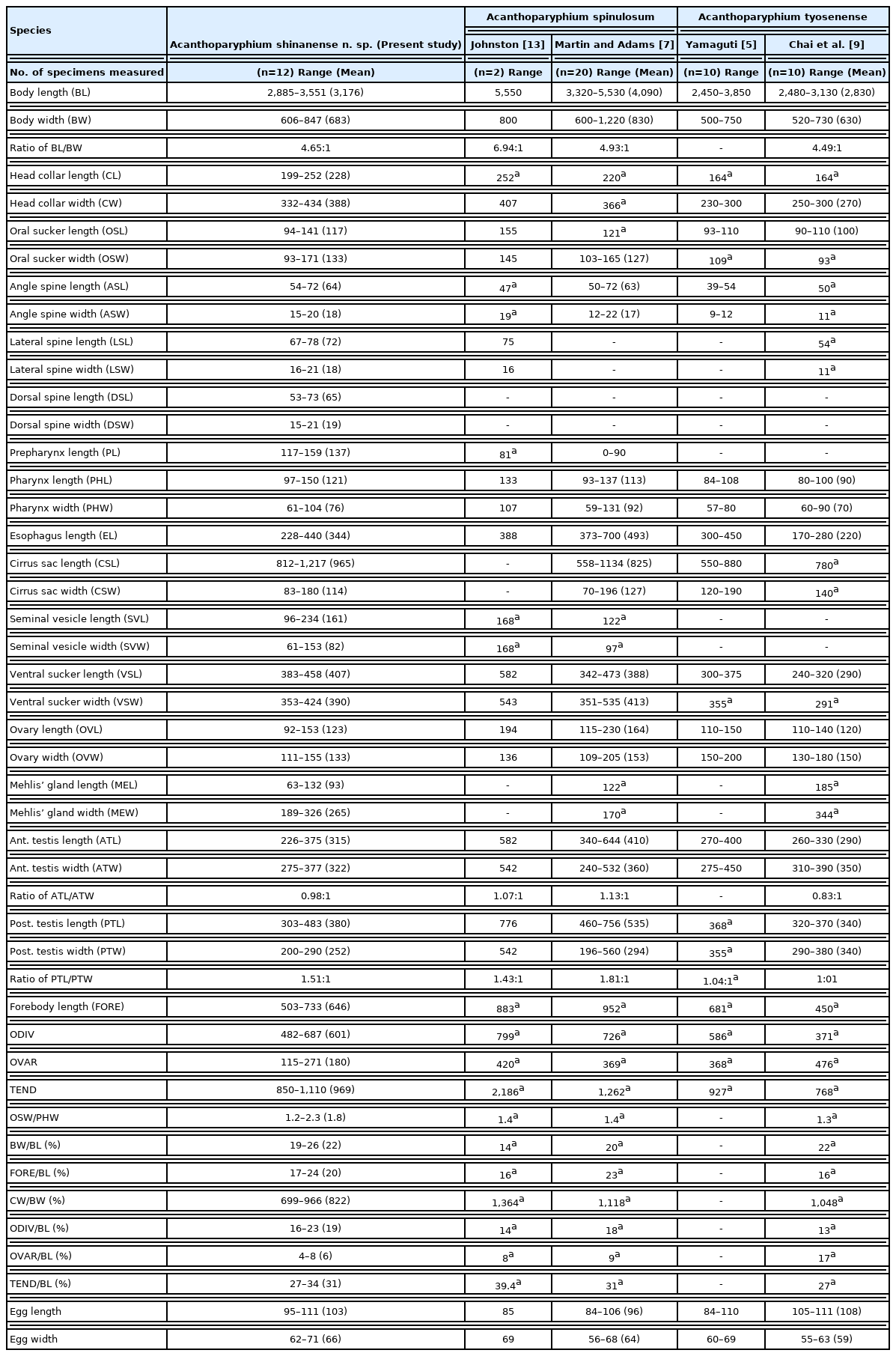 Species Acanthoparyphium shinanense n. sp. (Present study) Acanthoparyphium spinulosum Acanthoparyphium tyosenense