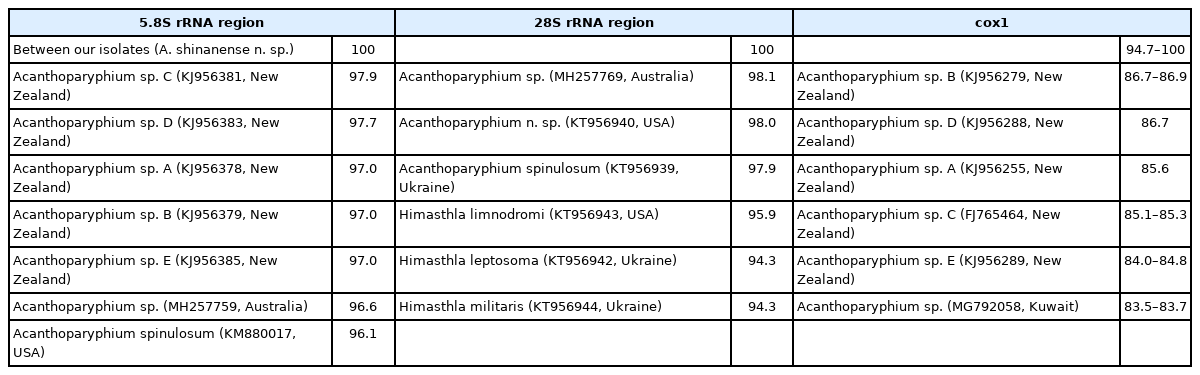 The amplification of 5.8S rRNA, 28S rRNA, and cox1 genes of our samples produced partial sequences of 459–460 bp, 754–1,134 bp, and 451 bp, respectively. The phylogenetic tree for 5.8S rRNA was established based on sequences of our samples, i.e., 1 isolate (MZ396401) from metacercariae in C. chinensis clams and 5 (MZ396396–396400) from adult flukes obtained from experimental chicks infected with metacercariae from R. philippinarum clams, in comparison with other members of the Echinostomatidae, including A. spinulosum from USA (KM880017) and Acanthoparyphium spp. from Australia (MH257759) and New Zealand (KJ956378, KJ956379, KJ 956381, KJ956383, KJ956385) (Fig. 4). The sequences of our samples (n=6) were clustered together (100% homologous) with high bootstrap values and constituted a new lineage distinct from other Echinostomatidae registered in GenBank (Fig. 4; Table 2). Our samples revealed low homologies with A. spinulosum from USA (96.1%), Acanthoparyphium sp. from Australia (96.6%) and New Zealand (97.0–97.9%) (Table 2).