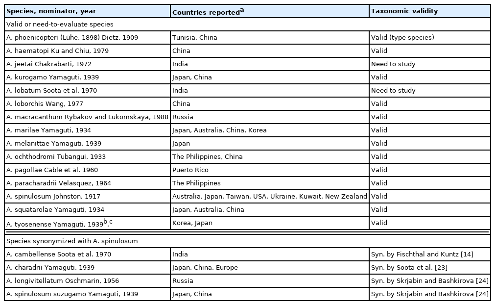 cThis species was considered a synonym of A. kurogamo by Skrjabin and Bashkirova [24] and Chen [25]. However, Chai et al. [9] re-examined the original specimens deposited in Meguro Parasitological Museum in Tokyo, Japan and concluded that the 2 species are valid because of various differential morphologies.