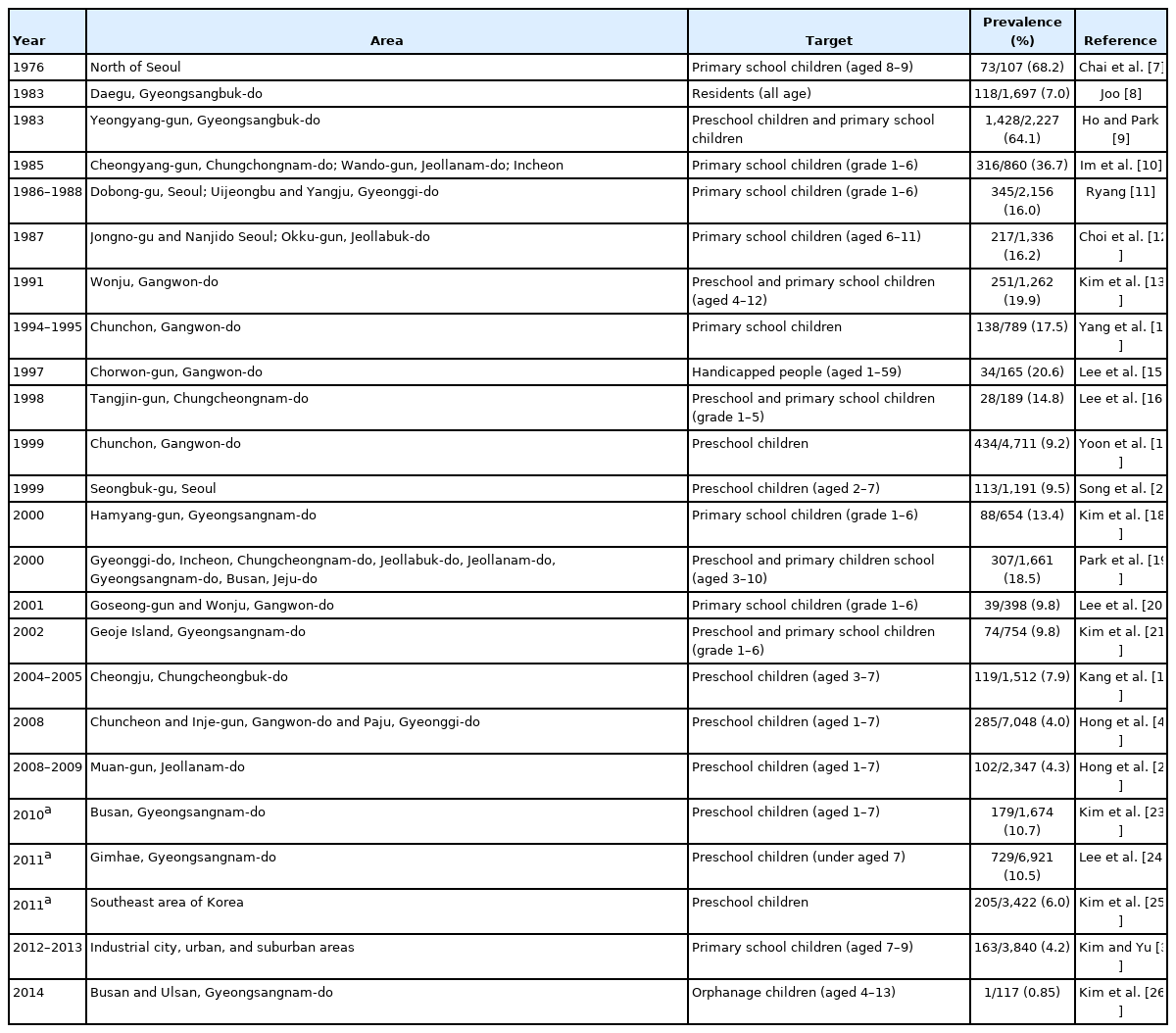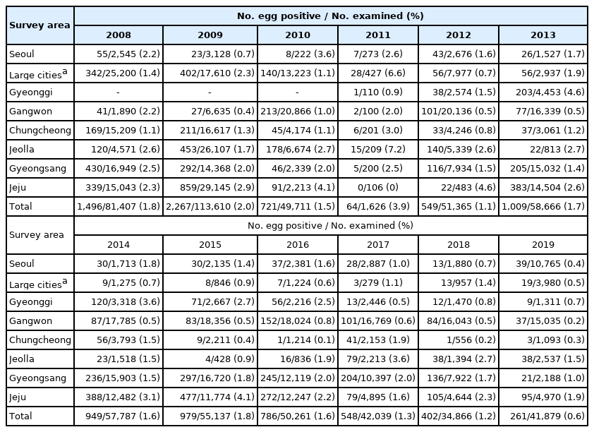 Table 1Yearly prevalence of Enterobius vermicularis infection among preschool children in various localities of the Republic of Korea (2008–2019)