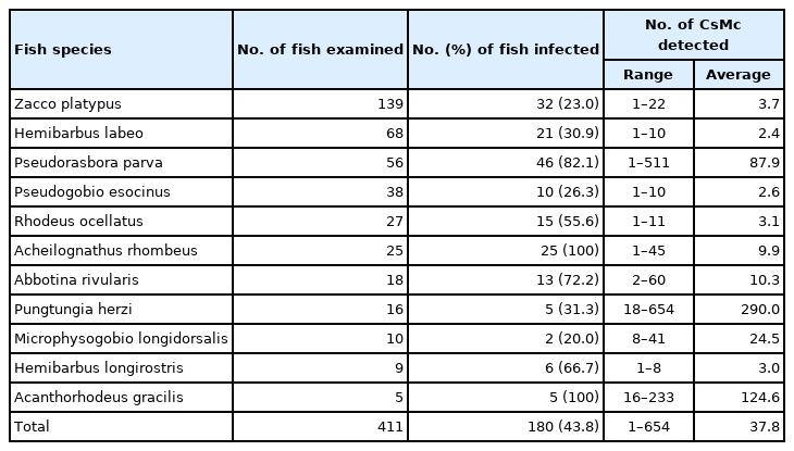 Table 1 Infection status of Clonorchis sinensis metacercariae (CsMc) in fishes from the irrigation canal of Togyo-jeosuji in Cheorwon-gun, Gangwon-do, Korea