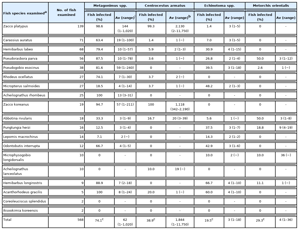 Table 2 Infection status of freshwater fish with zoonotic trematode metacercariae (ZTM) by fish species from the irrigation canal of Togyo-jeosuji, in Cheorwon-gun, Gangwon-do, Korea